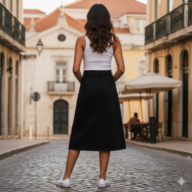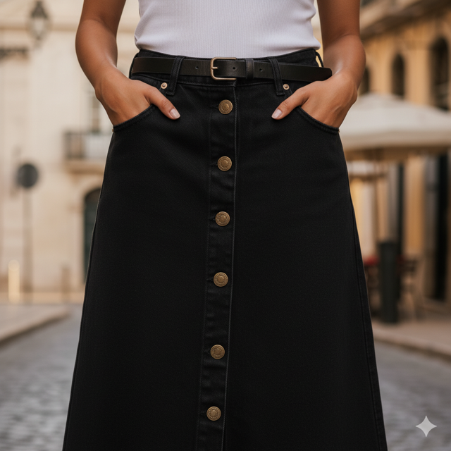 100% cotton denim, A-line, button front, side pockets. Made in India.