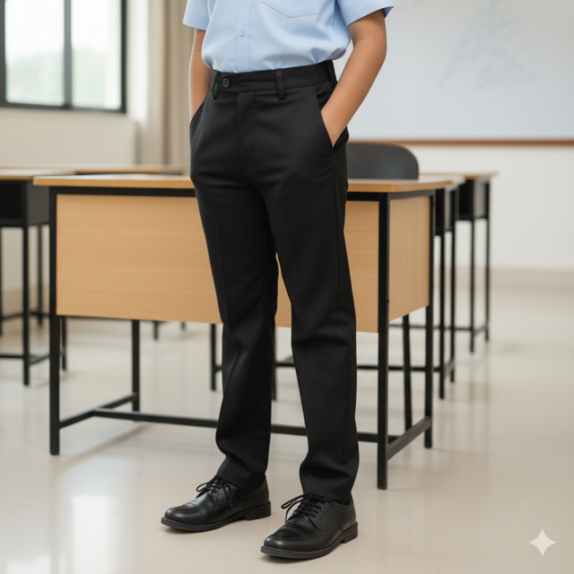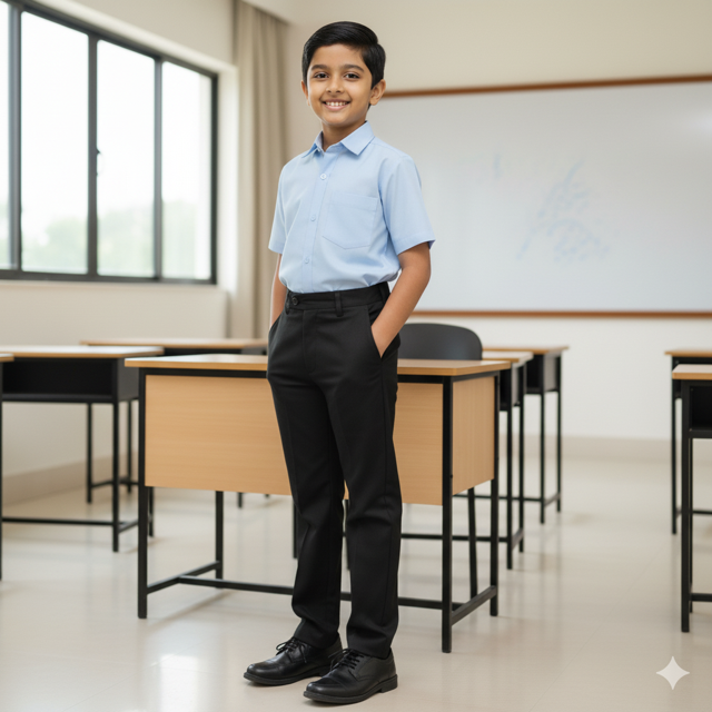 Poly-viscose (280 GSM), wrinkle-free finish, formal events and school functions. Made in India.