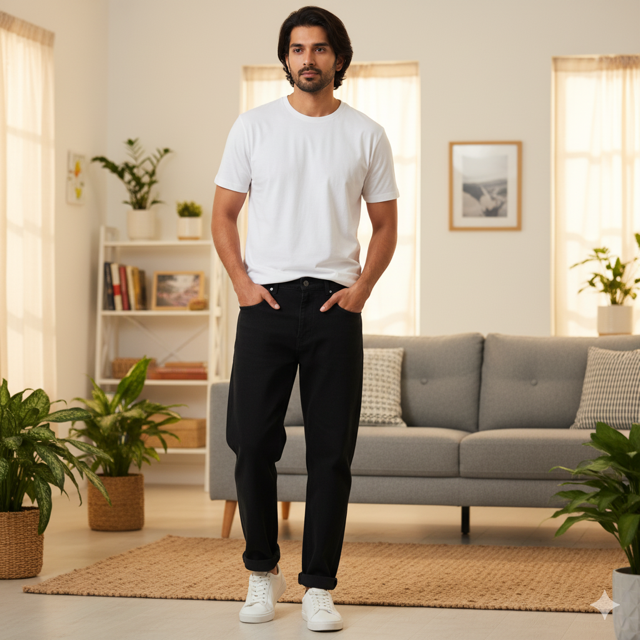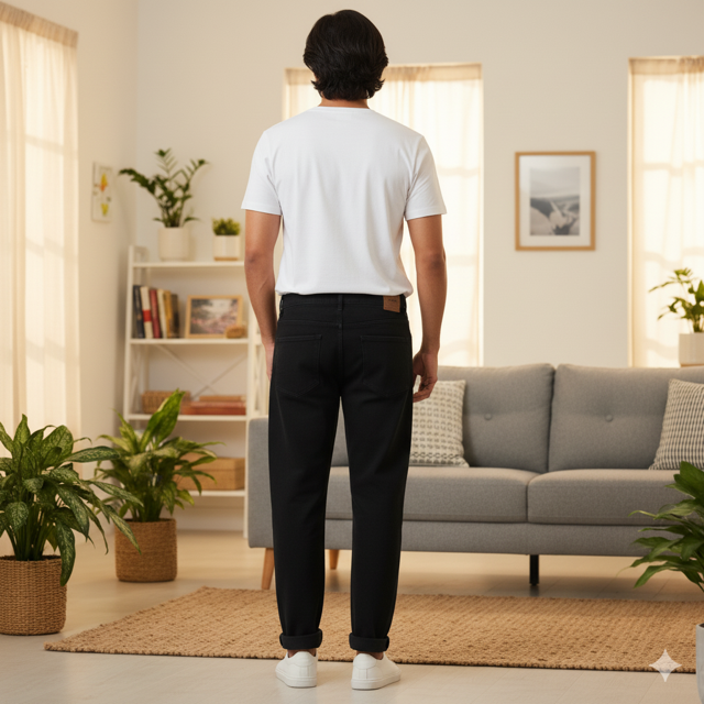 100% cotton denim, loose relaxed fit, classic blue-black color. Made in India.