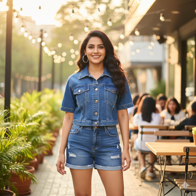 100% cotton denim, jacket style top, matching shorts. Made in India.