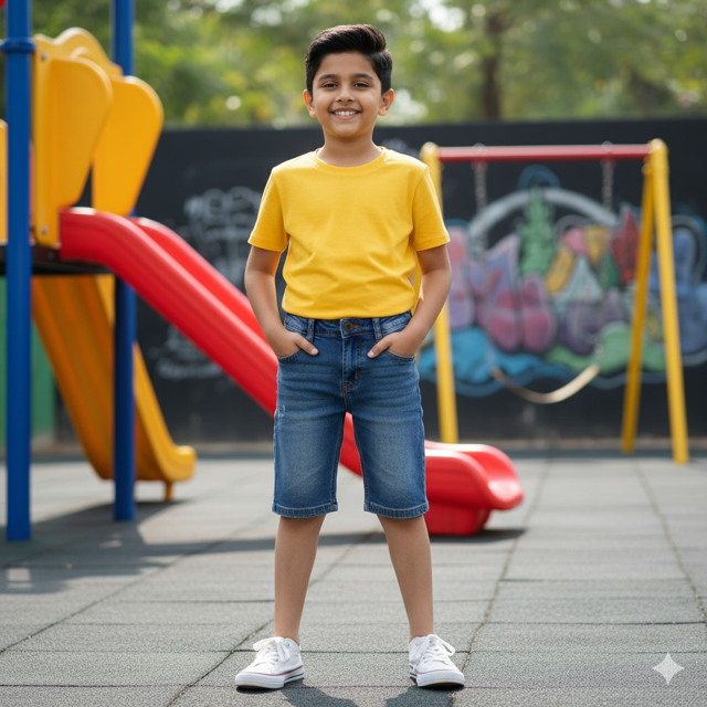 100% cotton denim, enzyme wash, button front, adjustable waist, summer casual. Made in India.