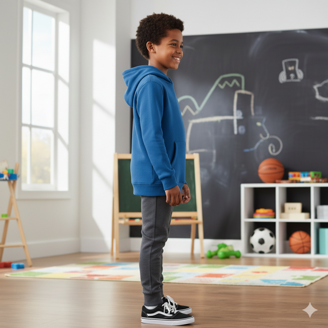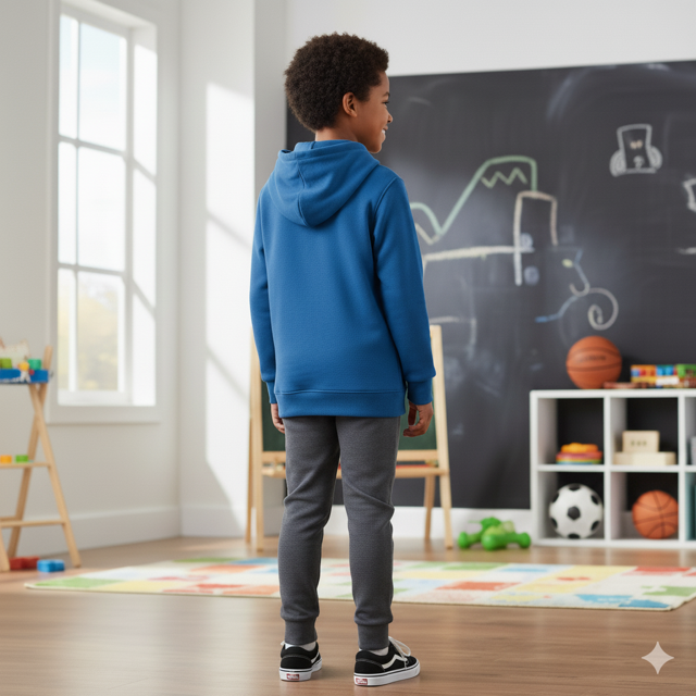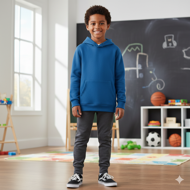 Cotton fleece (280 GSM), kangaroo pocket, drawstring hood, comfortable fit. Made in India.