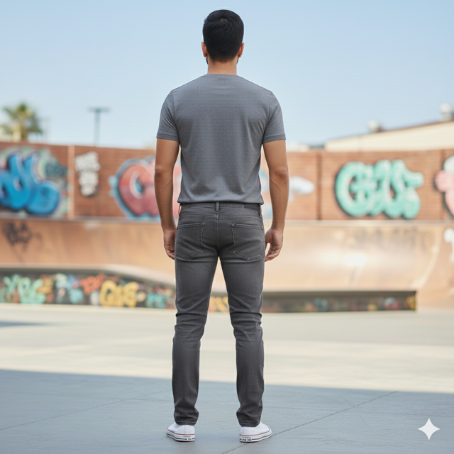 Cotton denim (290 GSM), charcoal gray wash, modern casual style. Made in India.