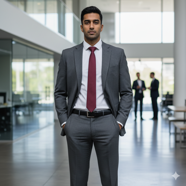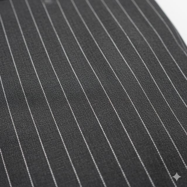 Wool-poly blend (300 GSM), subtle pinstripes, premium formal wear. Made in India.