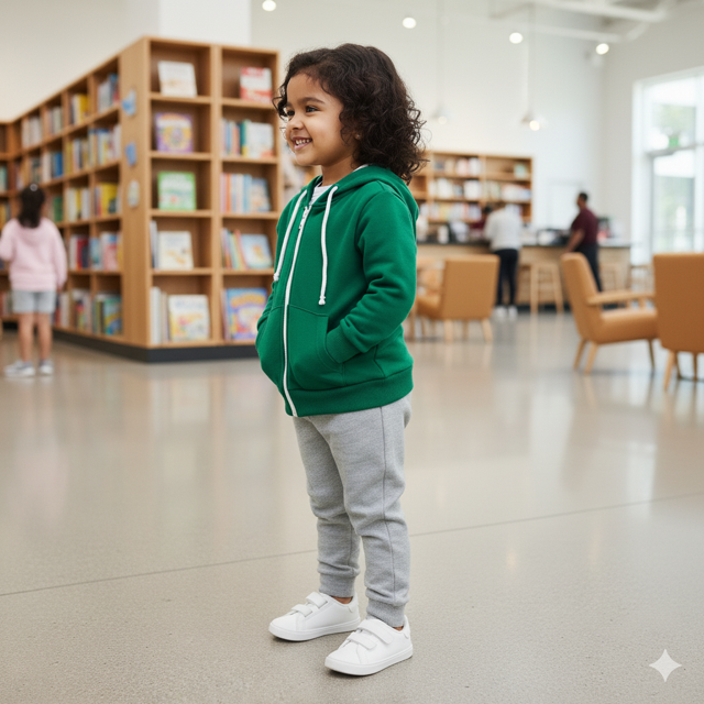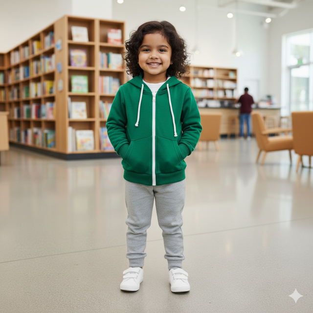 Cotton fleece (260 GSM), kangaroo pocket, ribbed edges, drawstring hood, comfortable fit. Made in India.