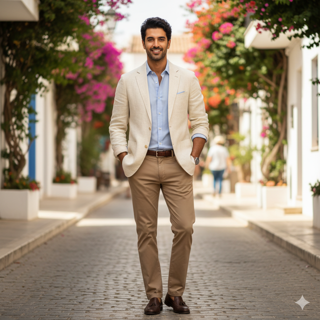 Linen-cotton (240 GSM), breathable, unlined, casual formal. Made in India.