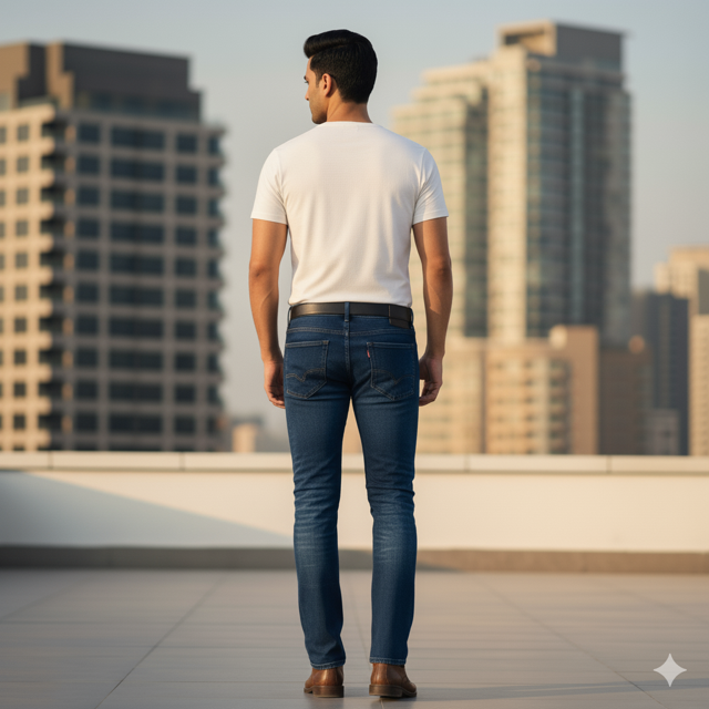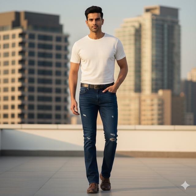 Cotton-elastane denim, strategic distressing and rips, modern edge. Made in India.