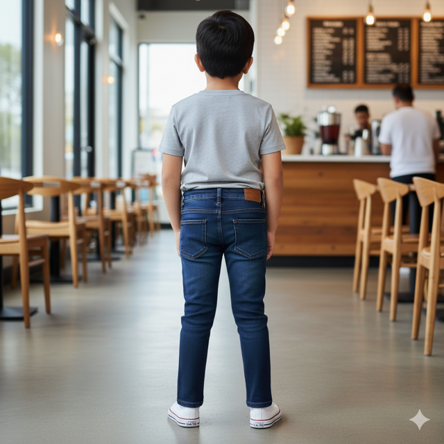 Cotton denim, stretch comfort, tapered fit, deep indigo color, button and zip closure. Made in India.