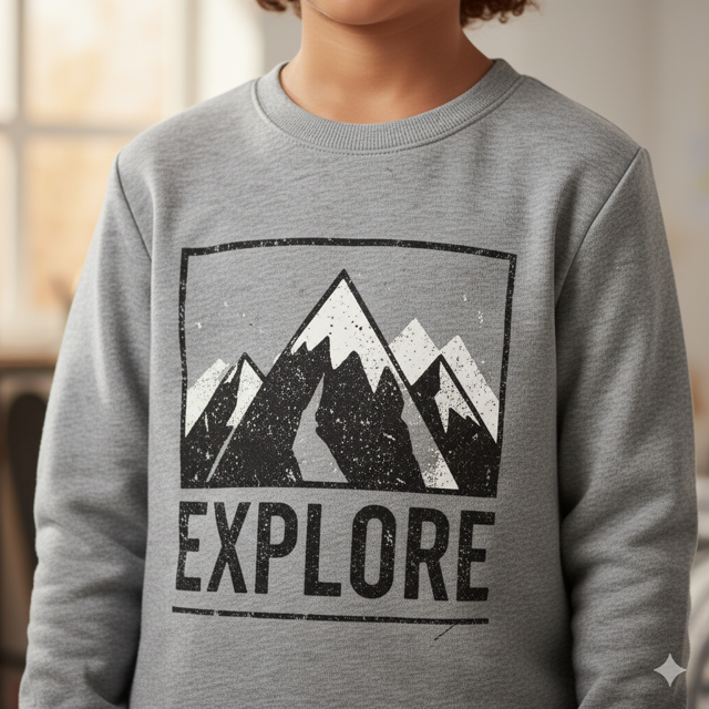 Cotton fleece (260 GSM), screen-printed design, ribbed detailing, comfortable. Made in India.