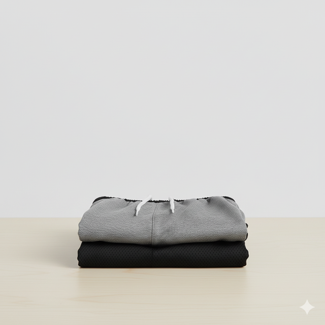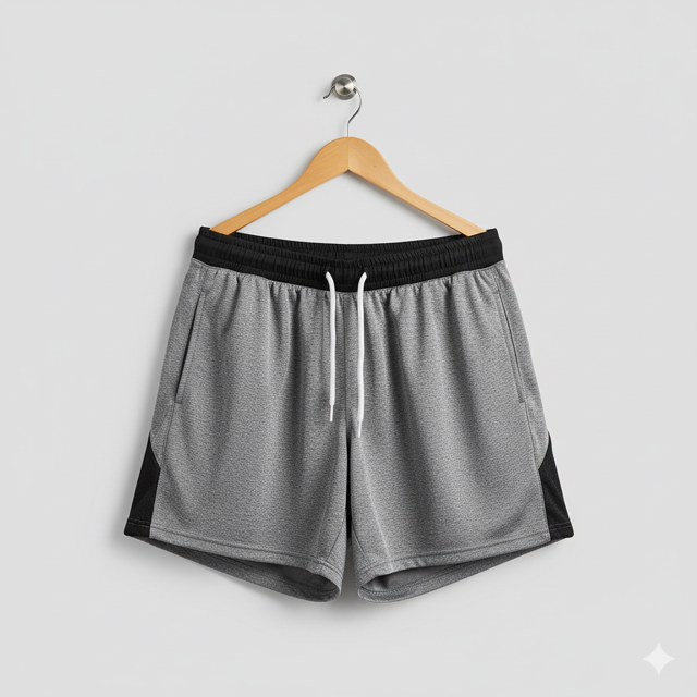 Polyester-cotton blend, elastic waist, quick-dry, active athletic. Made in India.