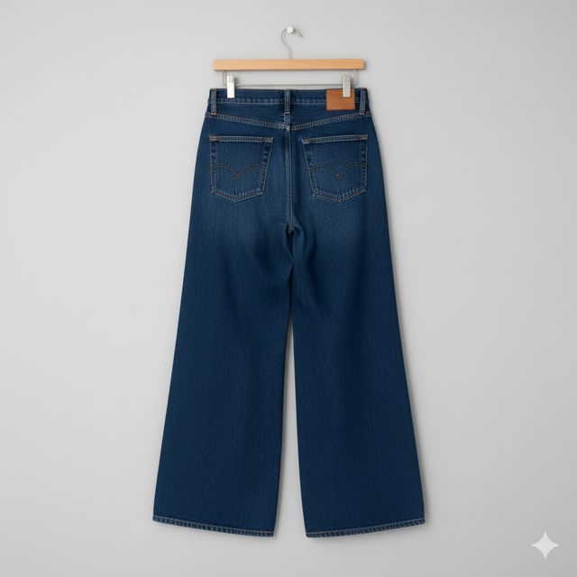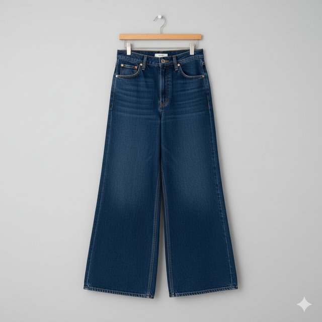 Cotton denim, high-rise, palazzo-style wide leg. Made in India.