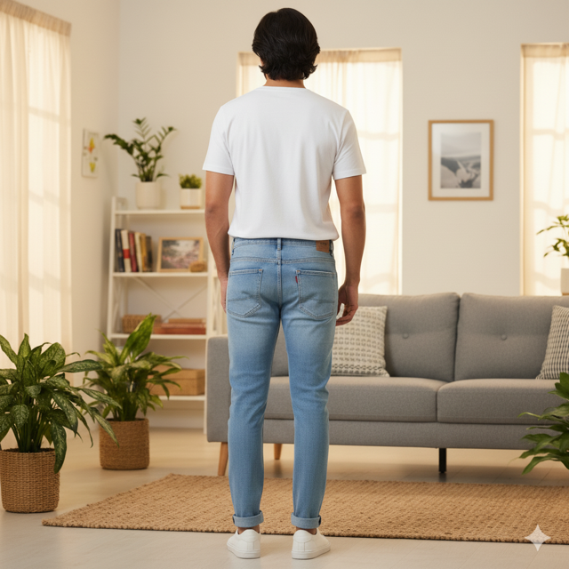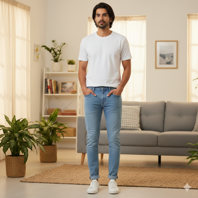 Cotton-elastane blend, vintage light wash, skinny tapered fit. Made in India.