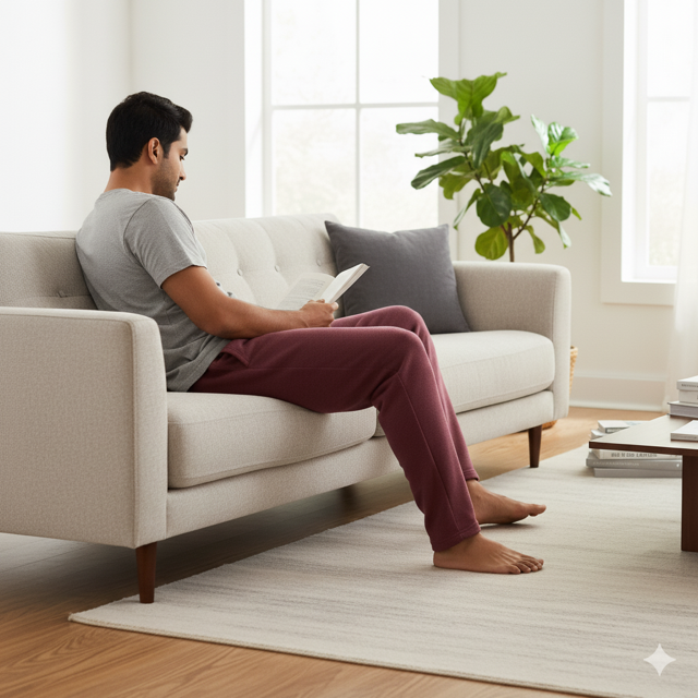Cotton jersey (240 GSM), elastic waist, comfortable fit for relaxing. Made in India.
