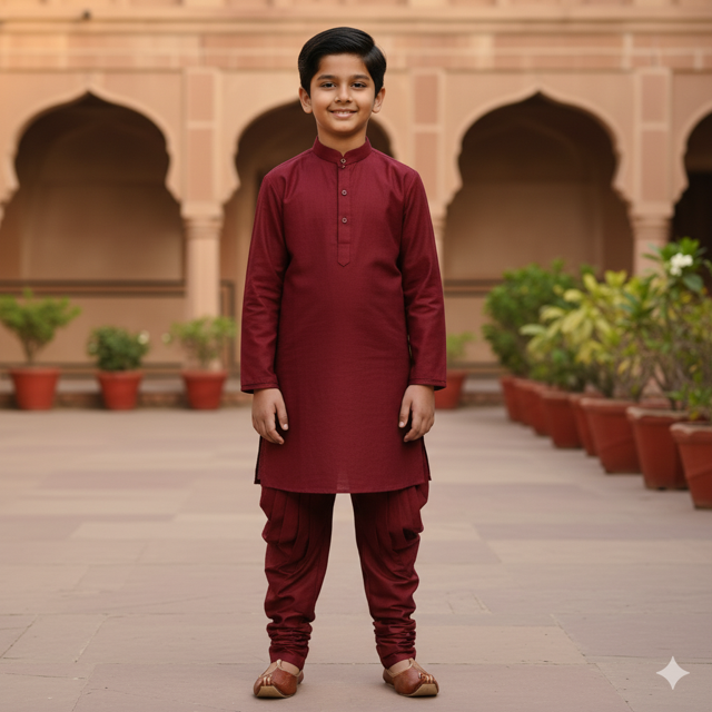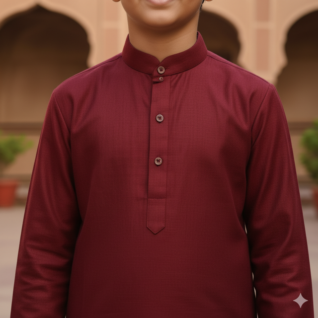 Cotton blend (240 GSM), full sleeves, side pockets, traditional pathani silhouette. Made in India.