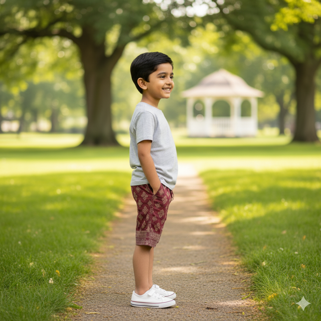 Cotton twill, colorful all-over print, elastic waist, comfortable everyday wear. Made in India.