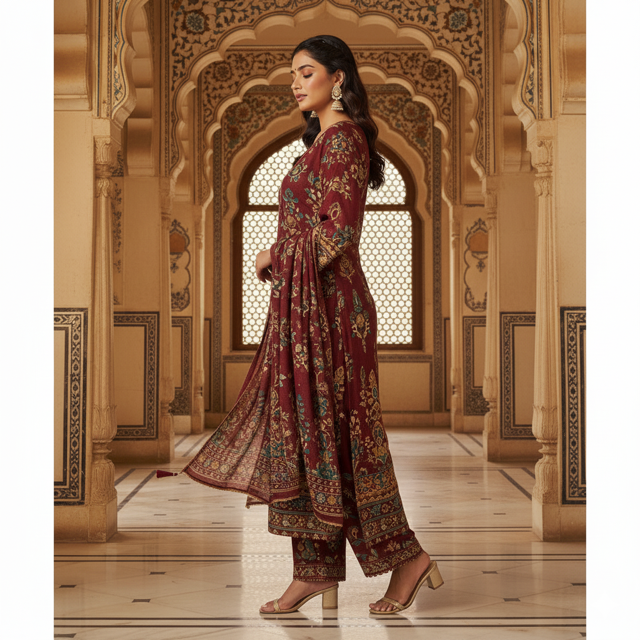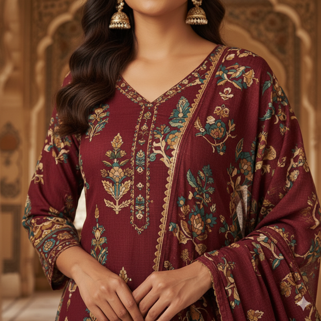 Cotton blend (200 GSM), digital print, kurta with pajama, matching dupatta. Made in India.