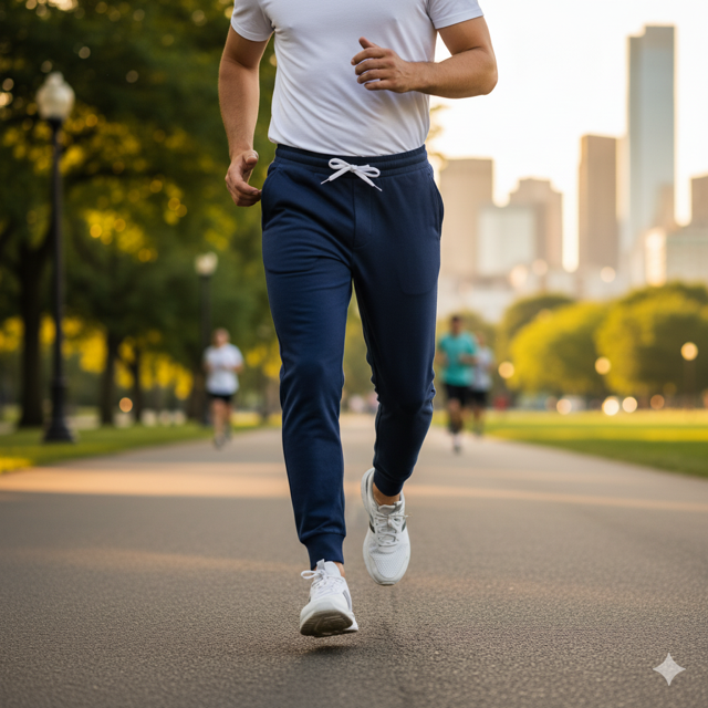 Cotton-poly blend (260 GSM), elastic waist, drawstring, ribbed cuffs. Made in India.