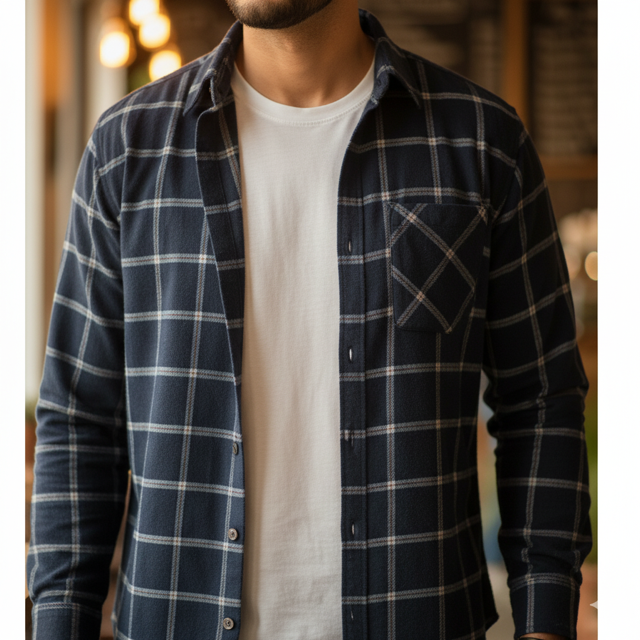 Cotton flannel (220 GSM), brushed finish, button front, perfect for cool weather. Made in India.