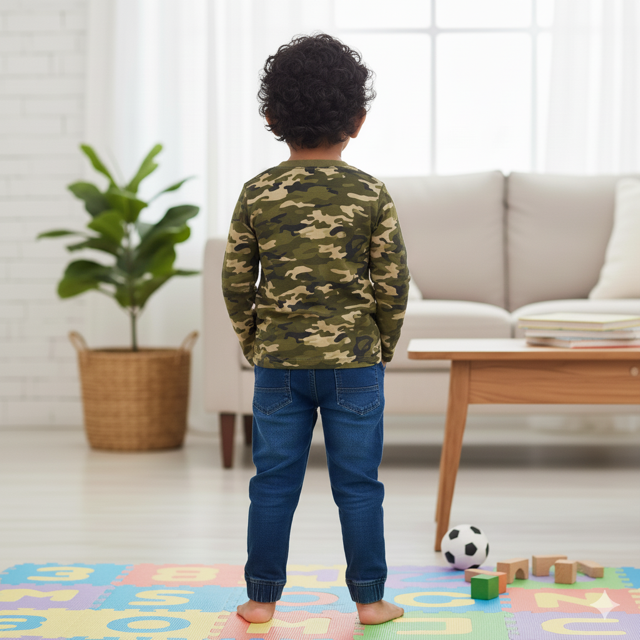 100% cotton knit (180 GSM), all-over camouflage pattern, crew neck, regular fit. Made in India.