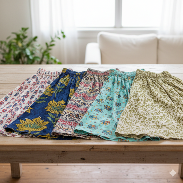 Cotton blend (180 GSM), all-over print, elastic waist, comfortable fit for everyday wear. Made in India.