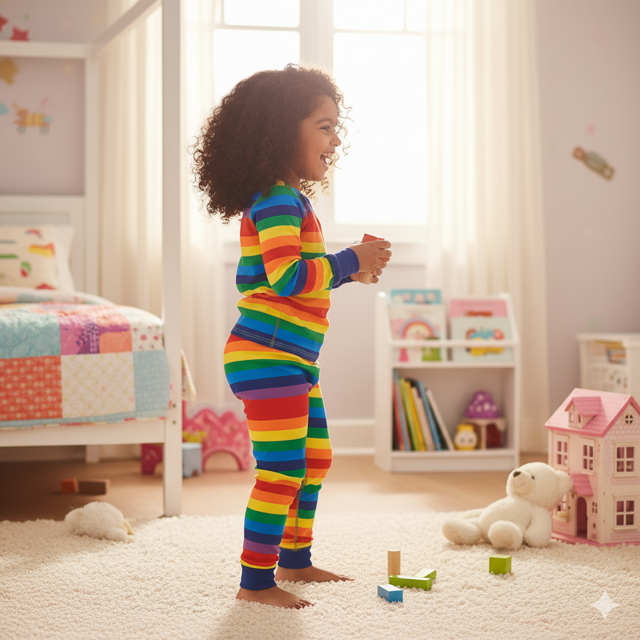 100% cotton knit (160 GSM), rainbow horizontal stripes, soft elastic waist, cuffed sleeves. Made in India.