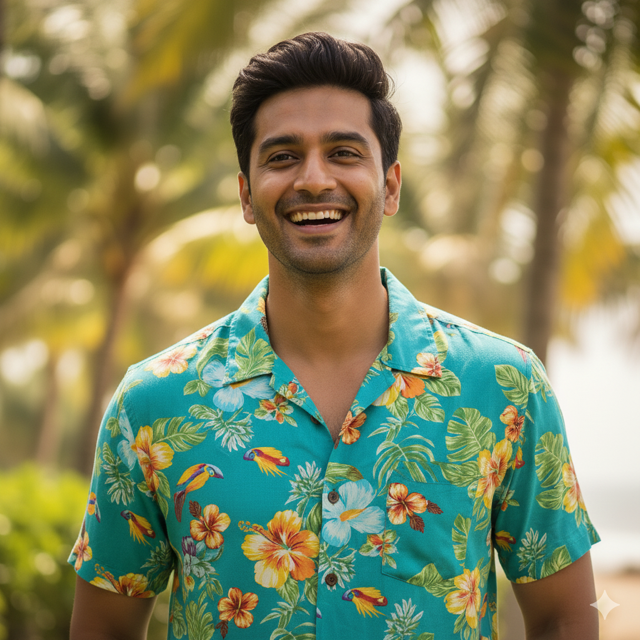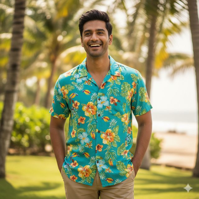 Rayon (160 GSM), vacation-inspired tropical print, button front, fun casual. Made in India.