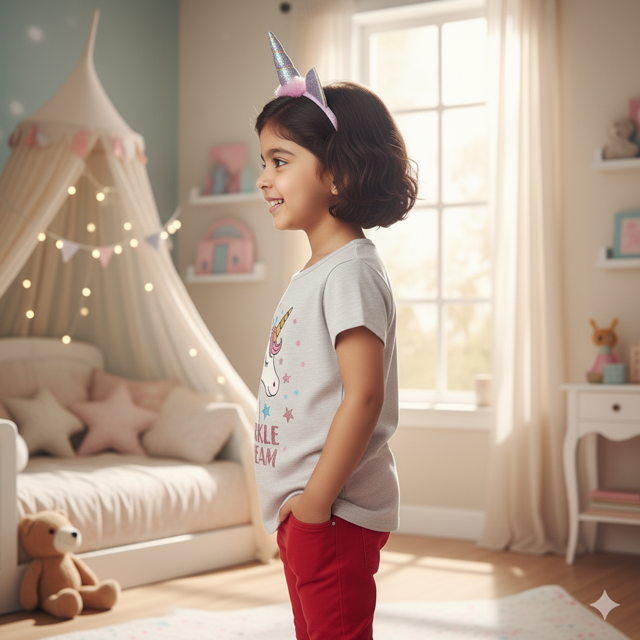 100% cotton knit (180 GSM), pre-shrunk. Crew neckline, short sleeves, digital printed magical unicorn graphic design, center front placement. Colour: Off-White base. Graphics: Colorful unicorn with stars and rainbow elements. Care: Machine wash cold (30°C) inside out. Do not bleach. Lay flat to dry or tumble dry low. Perfect for themed wear. Made in India.