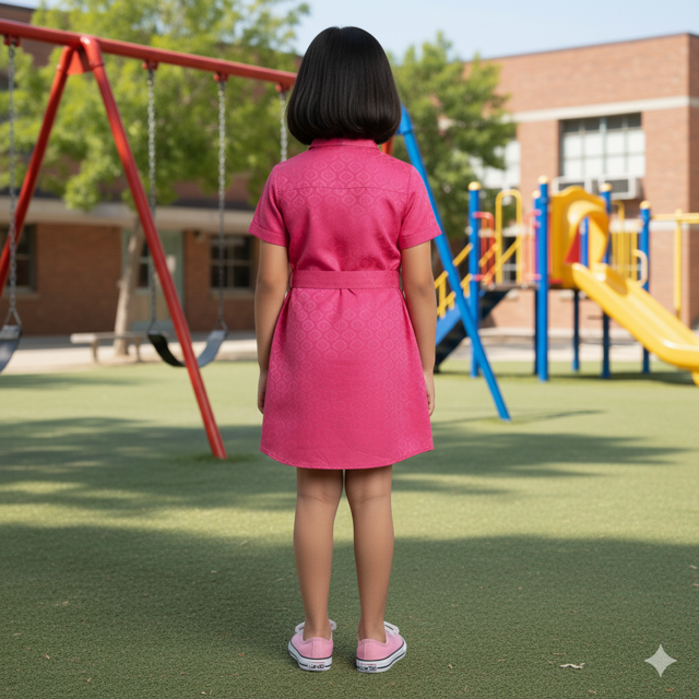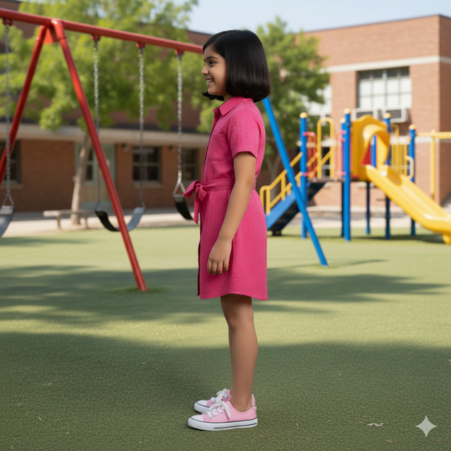Cotton-polyester blend (190 GSM), crisp and durable. Classic pink horizontal stripes, button-front closure, collared neckline, side slip pockets, curved hemline. Fabric: Wrinkle-resistant blend for easy care. Care: Machine wash warm (40°C). Iron on medium if needed. Stain resistant finish. Perfect for school, casual outings, and daily wear. Made in India.