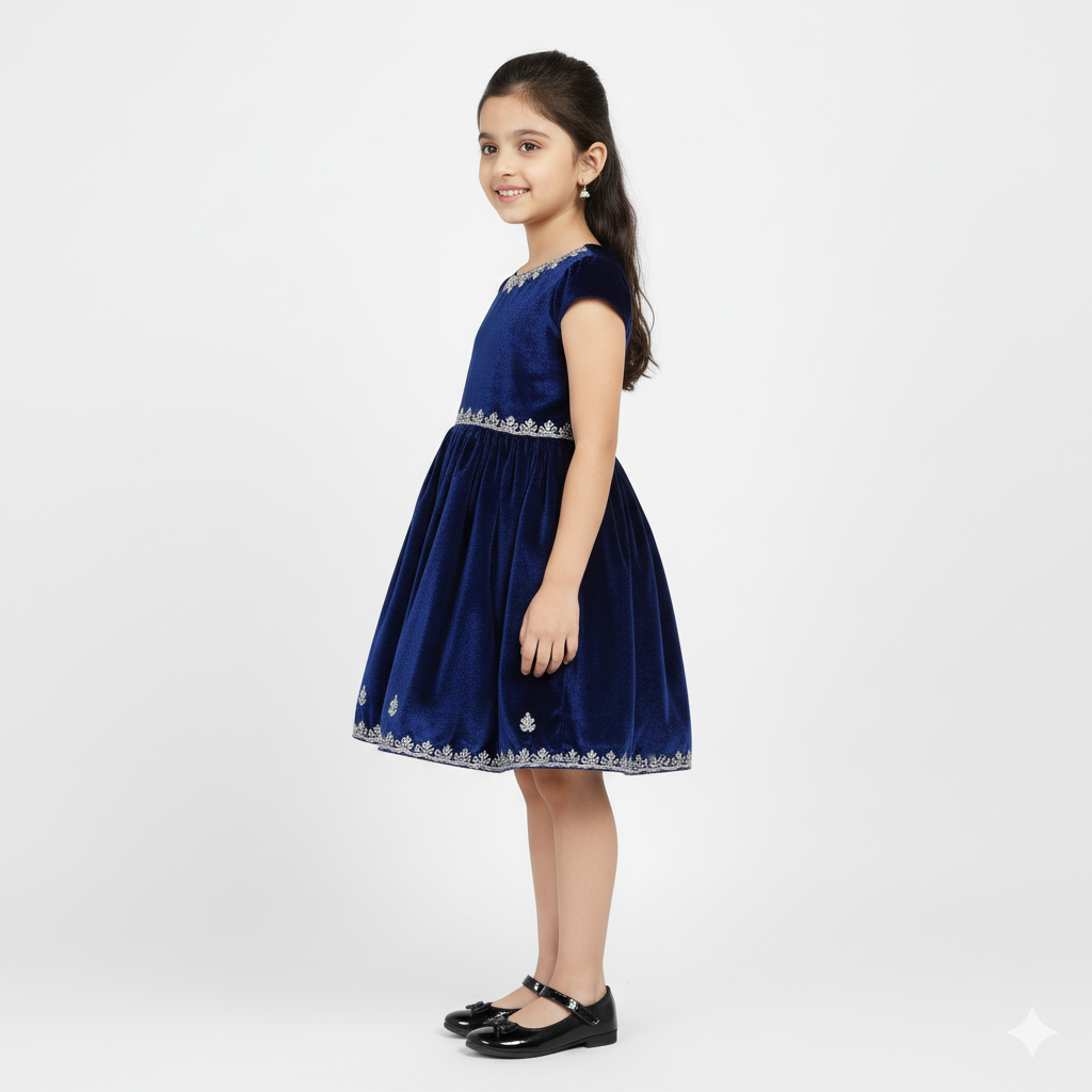 Navy Blue Velvet Party Dress with Hand Embroidered Details